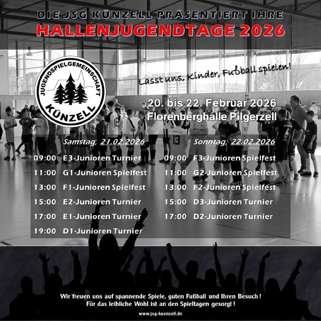 27.10.2025 - Die JSG Künzell präsentiert ihre Hallenjugendtage 2026, die gemeinsamen Jugendtage des TSV Künzell und des TSV Bachrain! Die Jugendspielgemeinschaft Künzell veranstaltet vom 20. bis 22. Februar 2026 wieder ihre gemeinsamen Hallenjugendtage in der Florenberghalle Pilgerzell. Im Rahmen dieser Veranstaltung sind mehrere Jugendturniere in den Altersklassen von den D- bis zu den G-Junioren geplant.