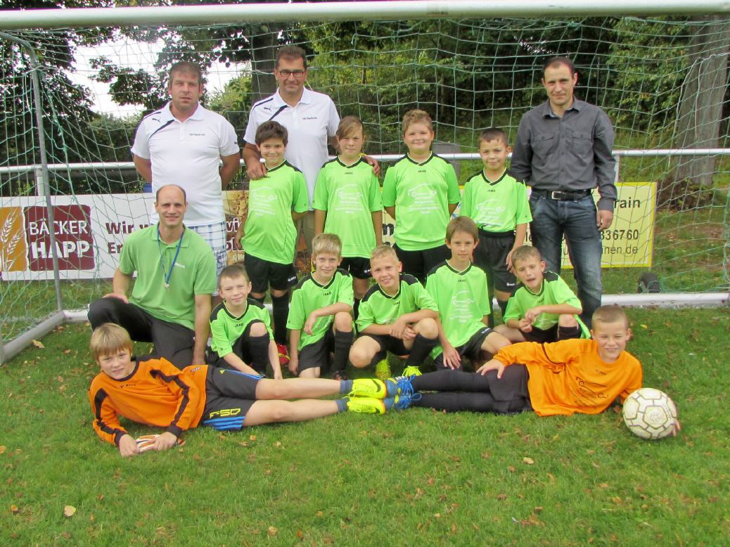 Die Einweihung: Erstmals trugen die E-Junioren, beim Spiel gegen die JSG Johannesberg/Oberrode, zum Sportfest 2014 des TSV Bachrain in Bachrain die neuen Trikots der Firma Eugen Brade. Mit viel Stolz der Kids wurden die neuen Trikots beim Spiel präsentiert. (dz)