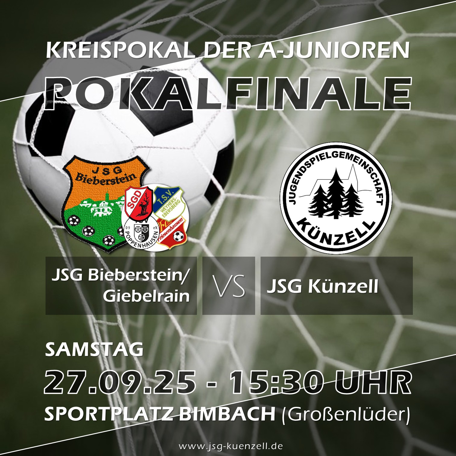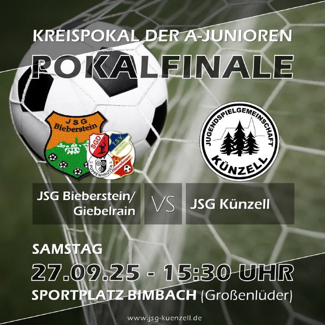 24.09.2025 - JSG Künzell im Pokalfinale! Am Samstag, den 27. September, um 15:30 Uhr ist es soweit: Die A-Junioren der JSG Künzell kämpfen in Bimbach um den Kreispokal. Im Endspiel wartet die JSG Bieberstein/Giebelrain als Gegner.