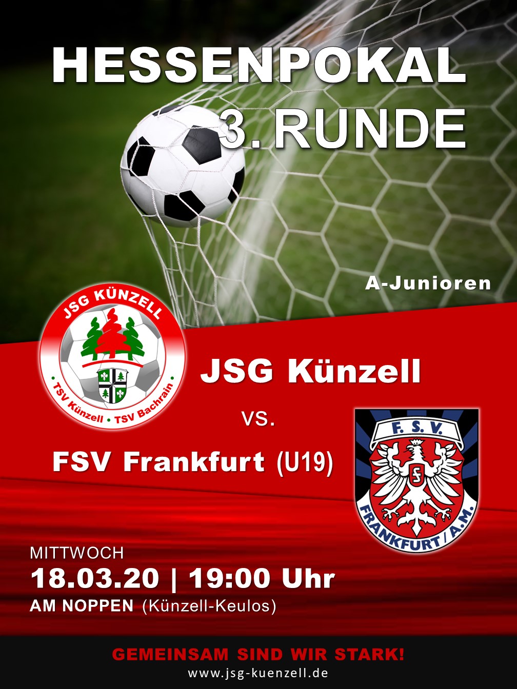 05.02.2020 - A1-Junioren zur 3. Runde des Hessenpokal, am Mittwoch, den 18.03.2020, um 19:00 Uhr gegen den FSV Frankfurt (U19) am Noppen in Keulos. Wir, die Trainer und auch die Spieler, würden uns über zahlreiche Unterstützung freuen. (dz)